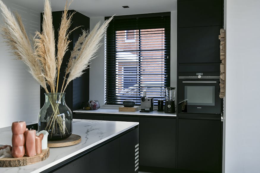 Sfeervolle zwarte keuken met matchende jaloezieën