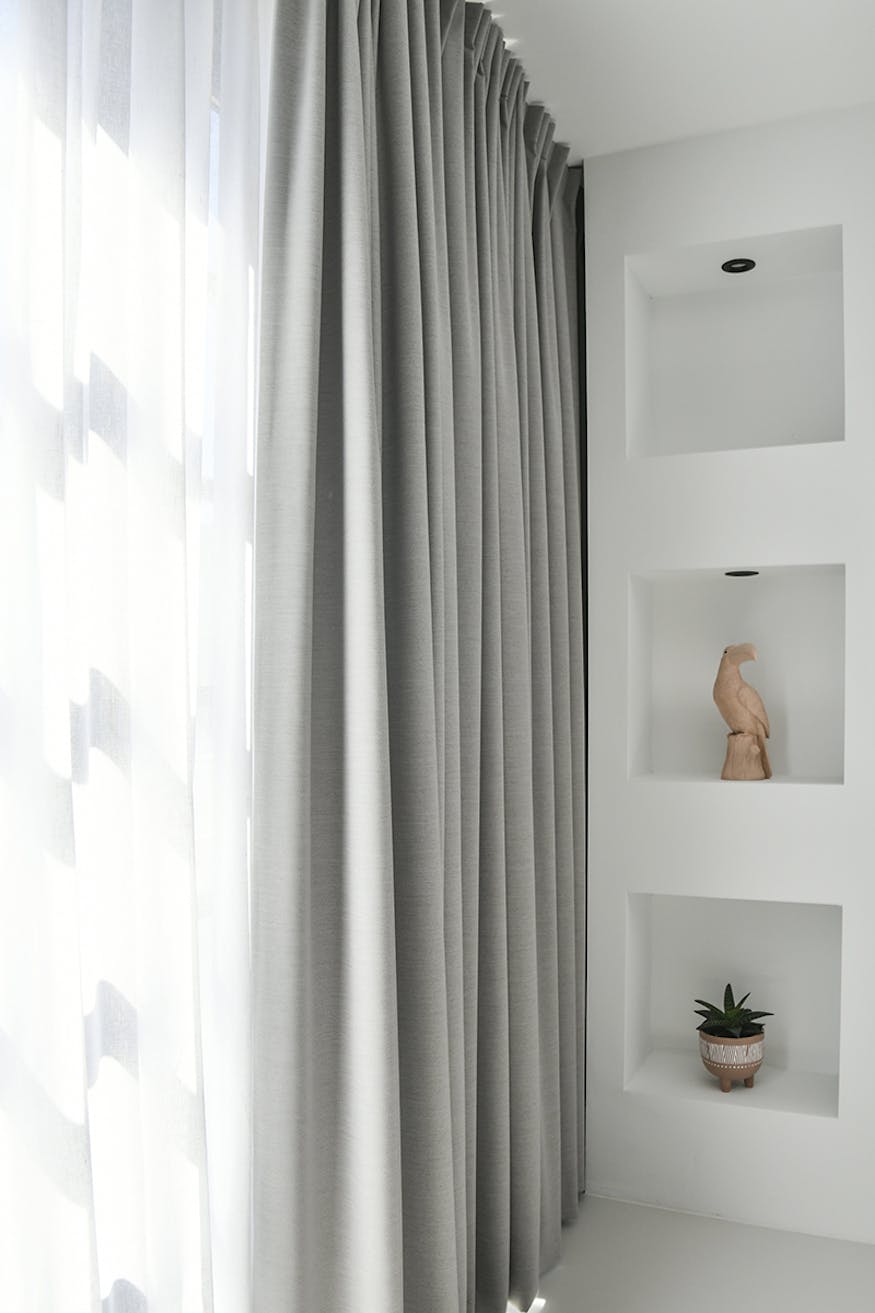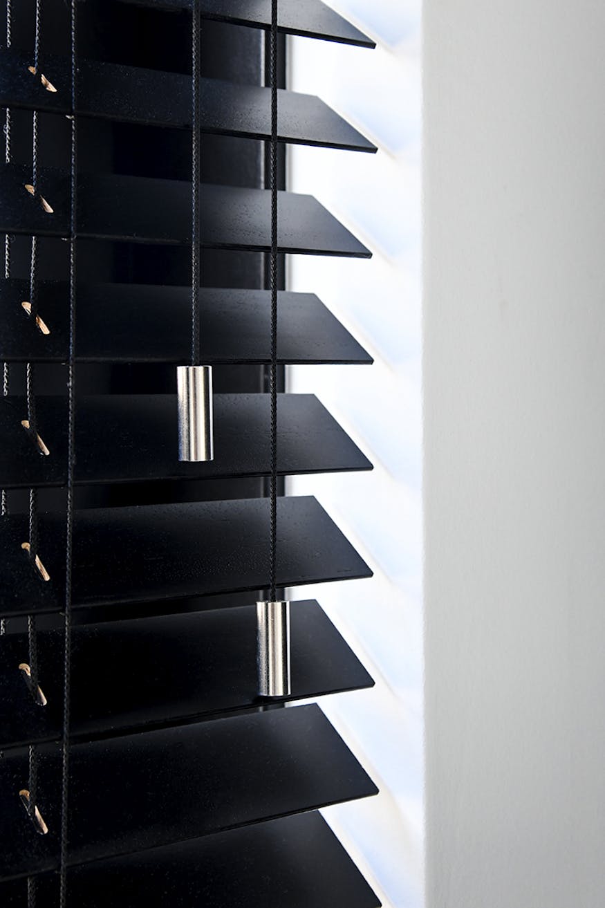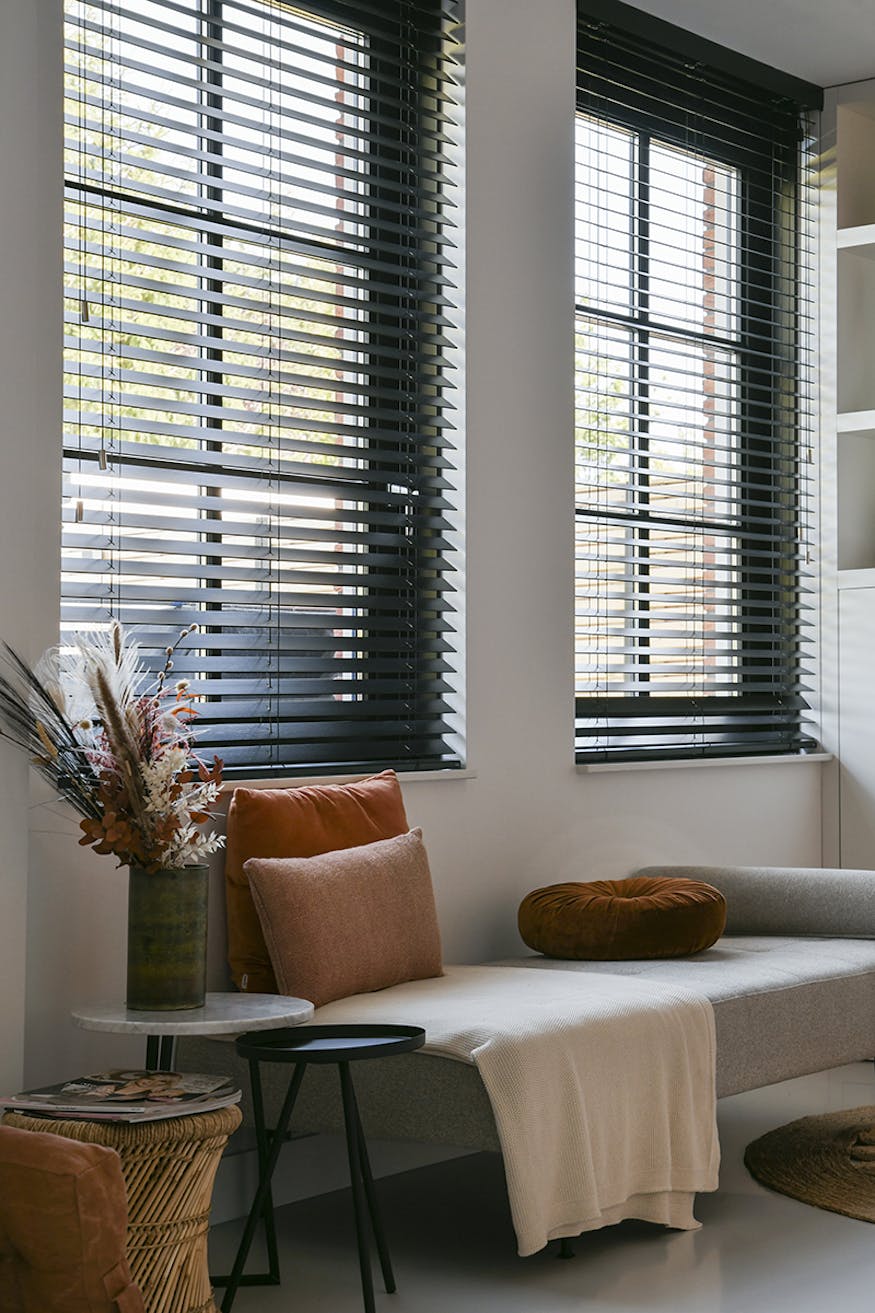 Trendy zwarte houten jaloezieën, sfeervolle gordijnen en een rolgordijn mini-cassette