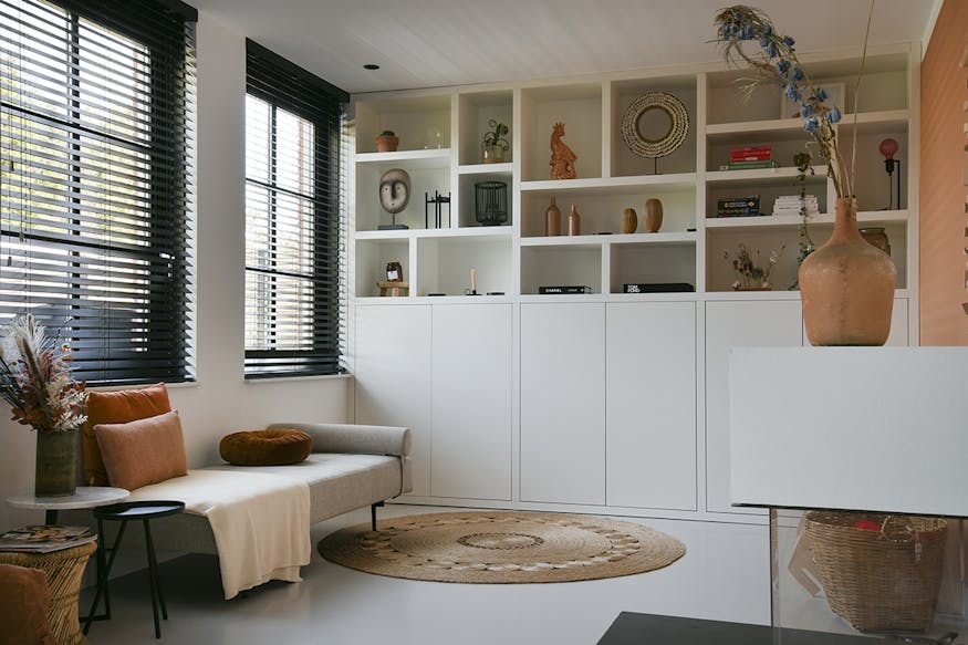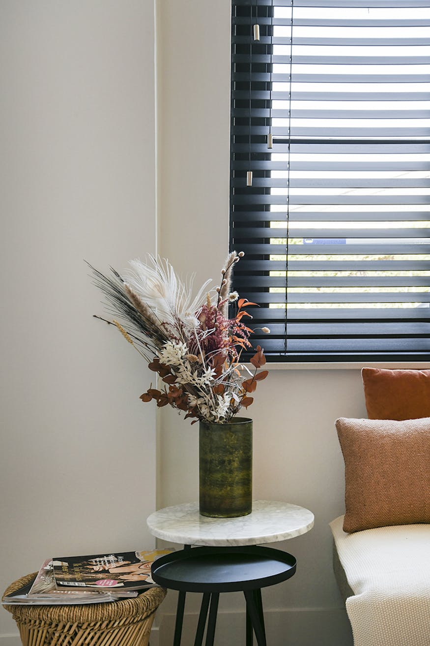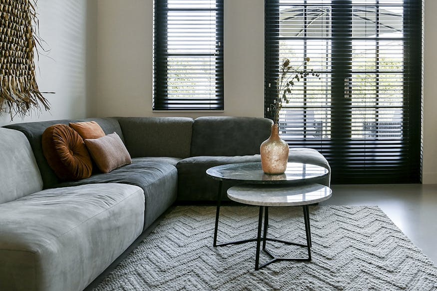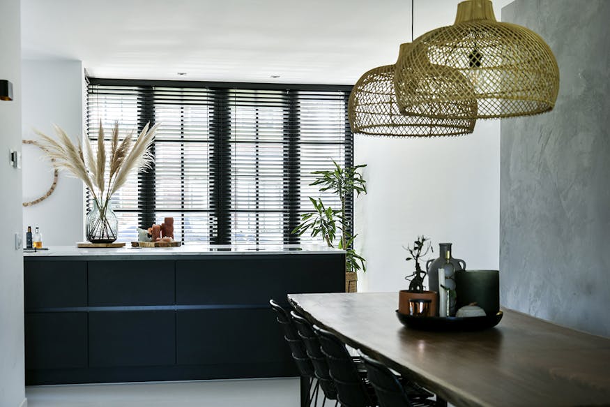 Familie Nederveen woont samen met hun zoon en dochter in het gezellige Rhoon. De woning is stijlvol ingericht en voorzien van prachtige raamdecoratie. inhuis plaza leverde de zwarte houten jaloezieën en de rolgordijnen mini-cassette voor verschillende ruimtes in huis.