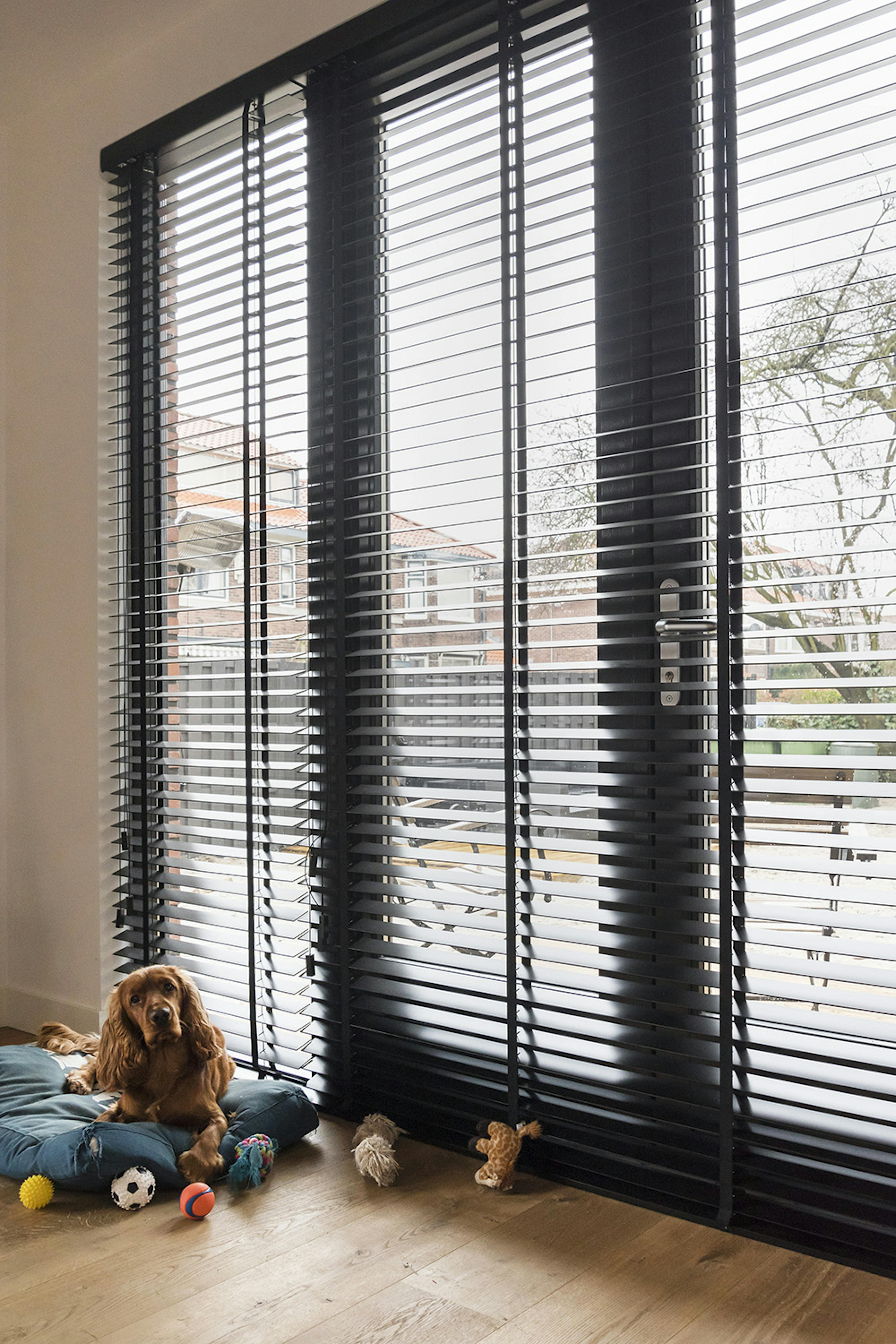 We wisten al dat we houten jaloezieën wilden hebben. We twijfelden alleen nog over de kleur. De keuze lag tussen houten jaloezieën in dezelfde kleur als onze lichthouten vloer of een contrasterende kleur. Uiteindelijk hebben we gekozen voor zwart, een contrasterende kleur. Dit maakt het geheel wat speelser en zorgt toch voor een chique uitstraling. De hele woning is voorzien van zwarte houten jaloezieën, zowel beneden in de woonkamer en keuken, als boven op de slaapkamers en in de walk-in closet.”