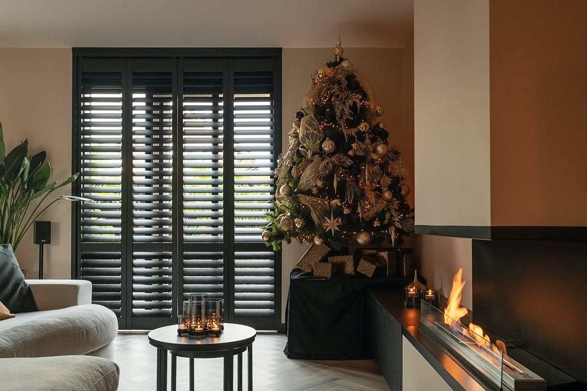 De hele woning is voorzien van zwarte houten jaloezieën, zowel beneden in de woonkamer en keuken, als boven op de slaapkamers en in de walk-in closet