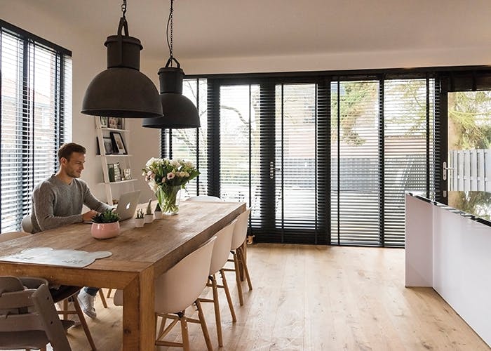 “Nadat de aanbouw zo goed als af was, zijn we gaan kijken voor raamdecoratie. Ik ben toen een beetje op internet gaan zoeken en kwam bij inhuis plaza terecht. Ik had inhuis plaza al vaker gezien op Instagram omdat ik Fred van Leer volg. Fred heeft ook van die mooie zwarte houten jaloezieën in zijn huis.