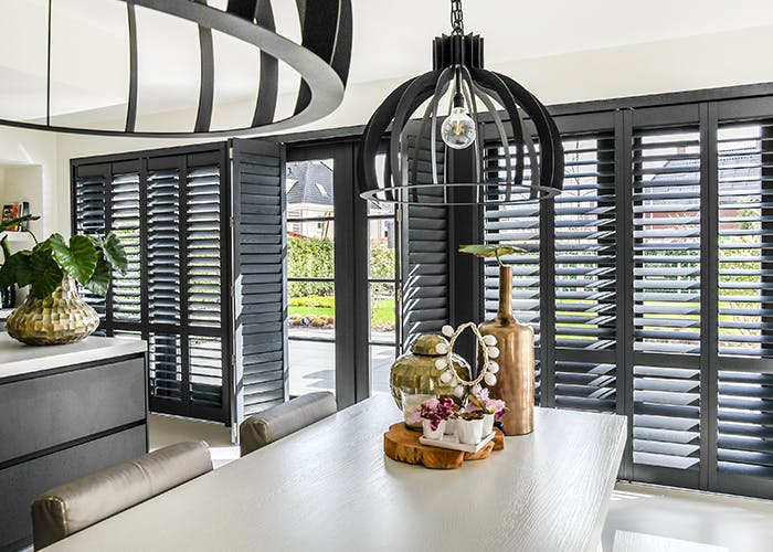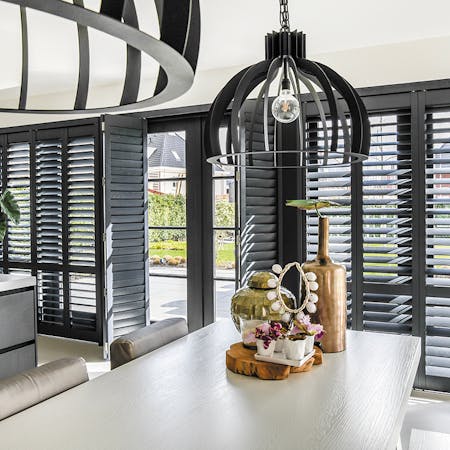 Goede én zonwerende raamdecoratie aanschaffen was voor Carola niet gemakkelijk. “De keuken is een grote open ruimte met veel ramen. Dit was een bewuste keuze, maar nu er bij ons achter ook woningen worden gebouwd, werd het noodzakelijk om iets voor de ramen te hangen. Buitenzonwering viel al snel af, omdat het huis wit is en er dan een cassette op de gevel bevestigd zou moeten worden. Dit vonden we niet mooi. Uiteindelijk kwamen we uit op shutters. Ik kende inhuis plaza al en het voelde gelijk goed. De monteur heeft goed meegedacht hoe de shutters het beste gemonteerd konden worden. Ze vallen nu mooi tussen de pilaren in, waardoor het goed bij de pui past en het erin wegvalt.”