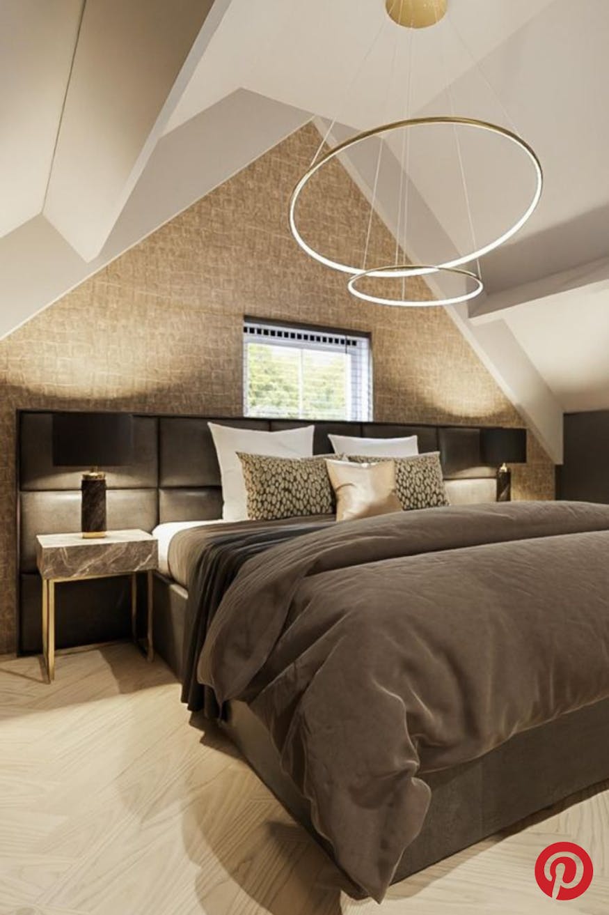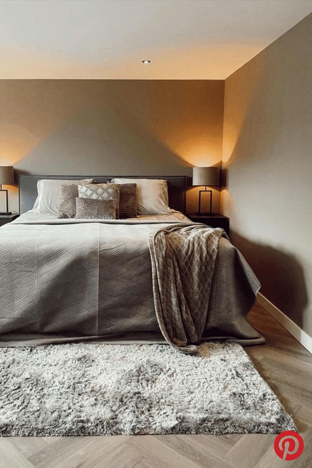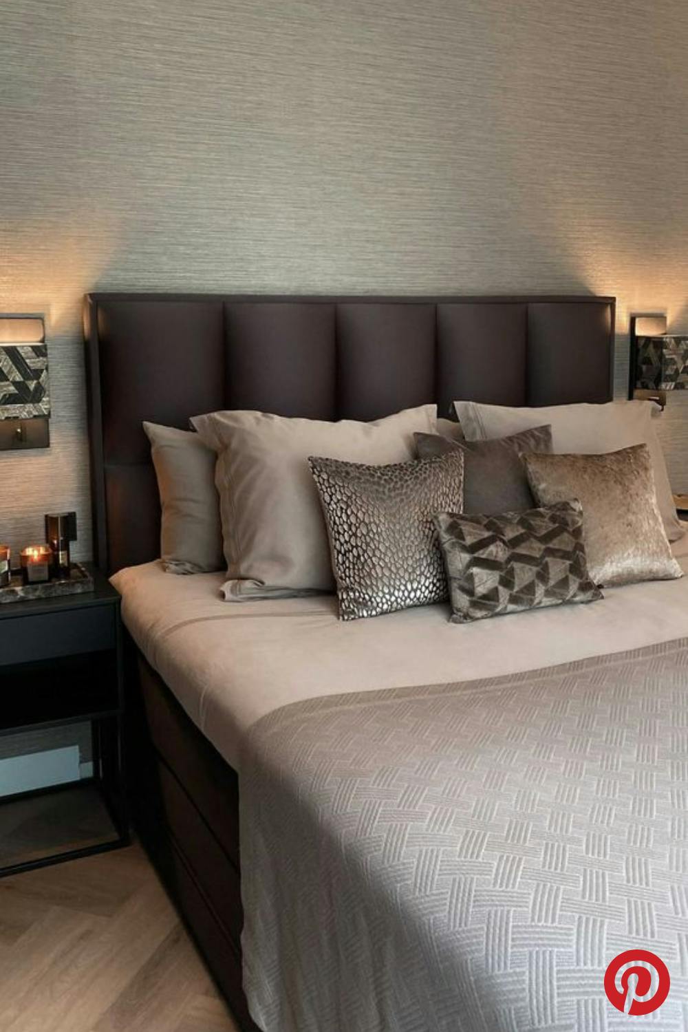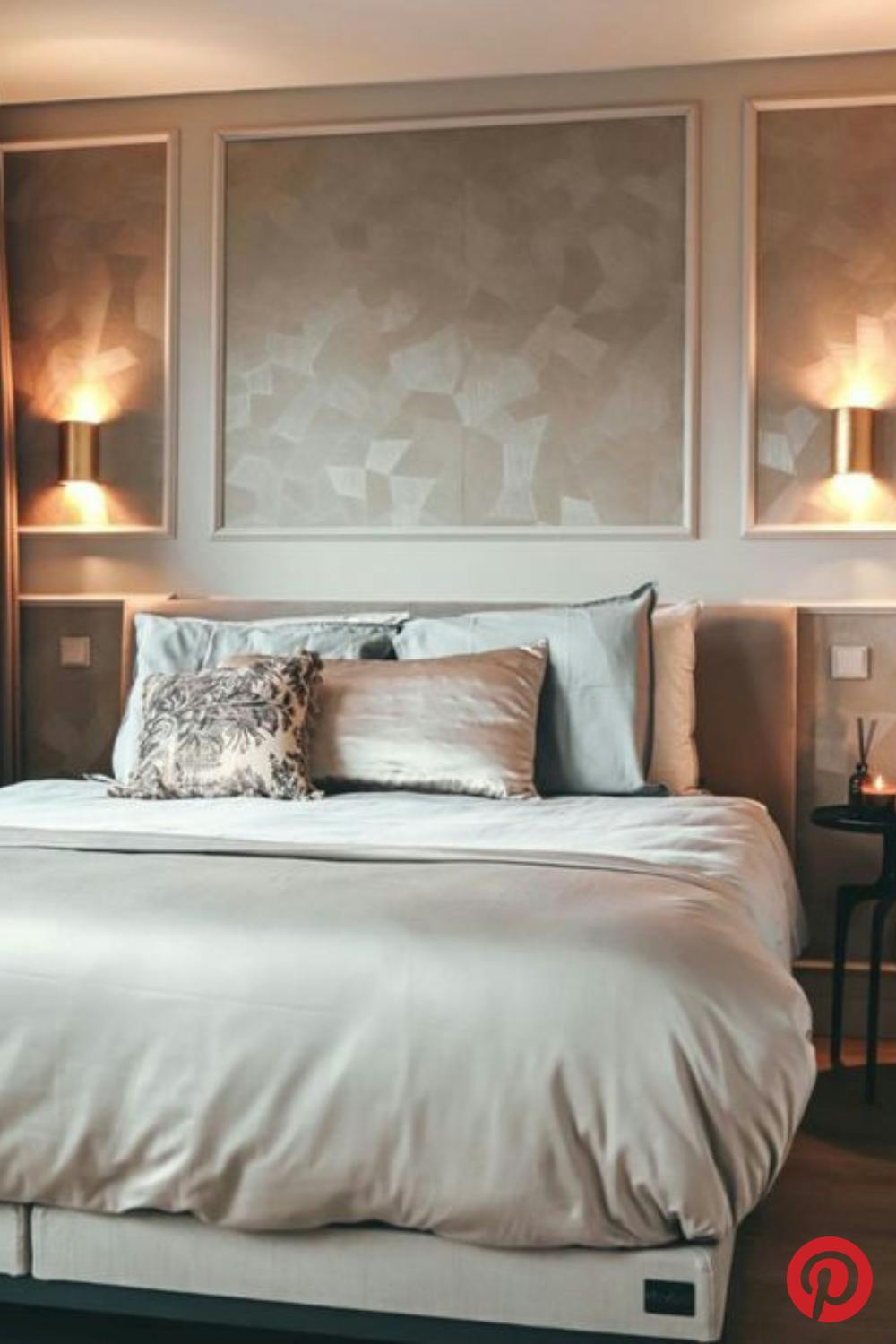 Je ziet veel zachte en neutrale kleuren terug in een hotel chique slaapkamer. Denk aan crème, beige of lichte grijstinten. Deze tinten creëren een rustige en elegante sfeer, wat al snel voor dat unieke hotelgevoel zorgt. Kies bijvoorbeeld voor een zacht beige muurkleur en behang dat qua kleur naadloos aansluit op de muurkleur en combineer dit met een bruin bed, marmeren nachtkasjes en gouden sierkussens.
