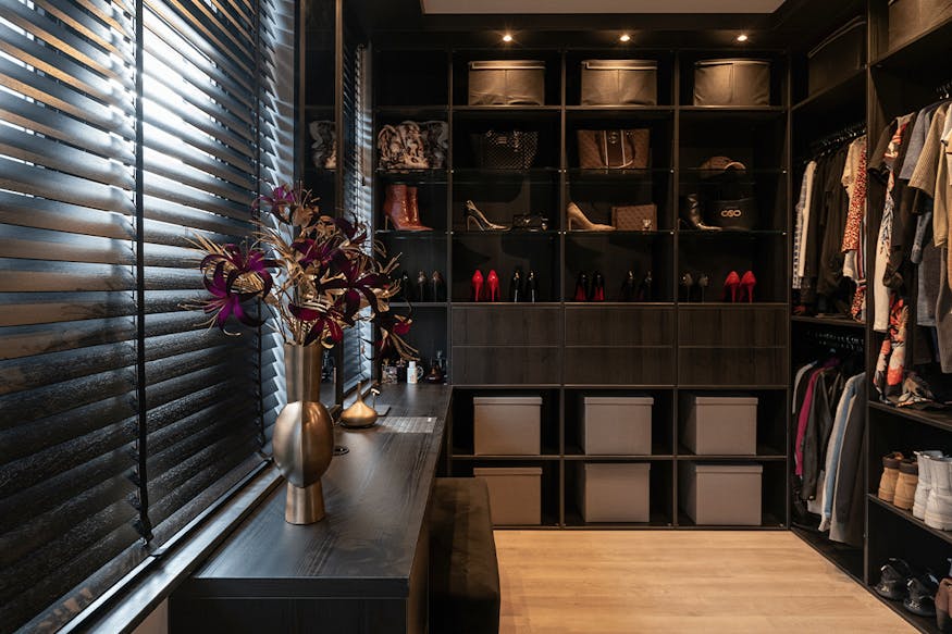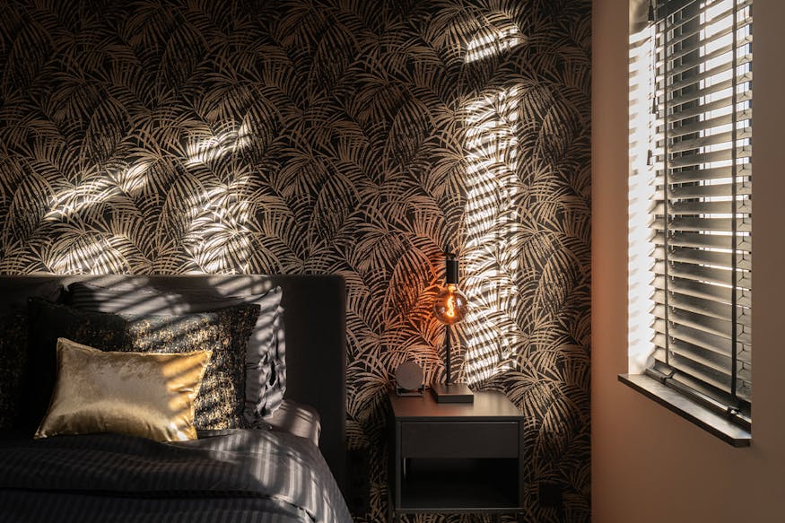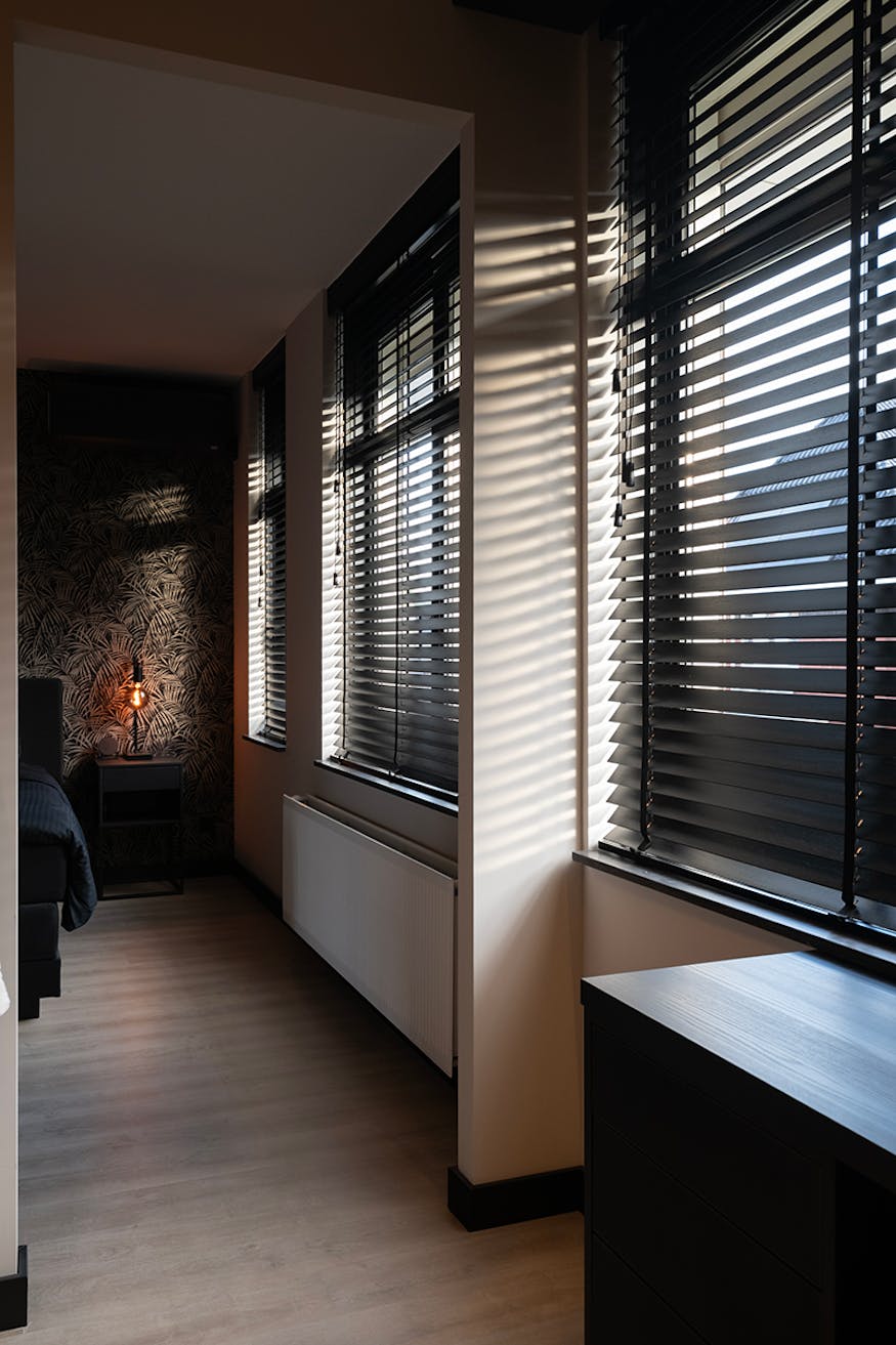 Op de eerste verdieping vind je in het kantoor, de slaapkamers én inloopkast houten jaloezieën 50mm terug. Met dit type raamdecoratie kies je niet alleen voor eenvoudige lichtregulatie en privacy, maar het maakt de ruimtes ook af met hun warme uitstraling.