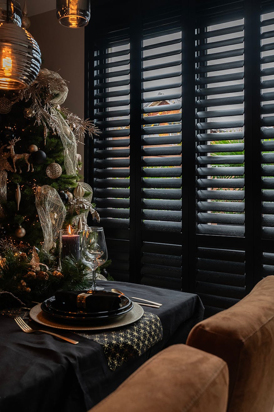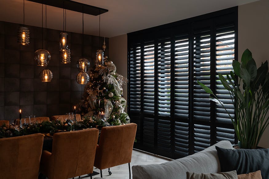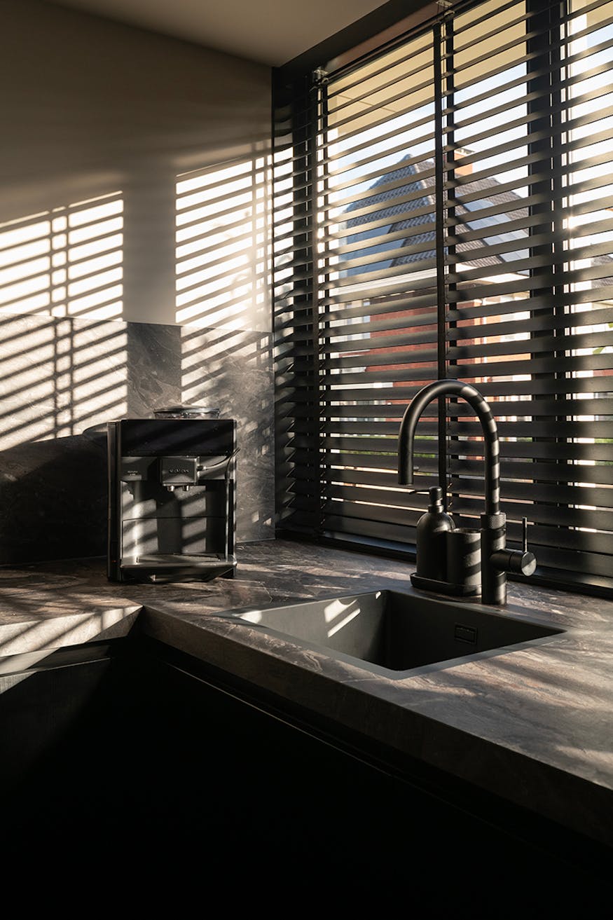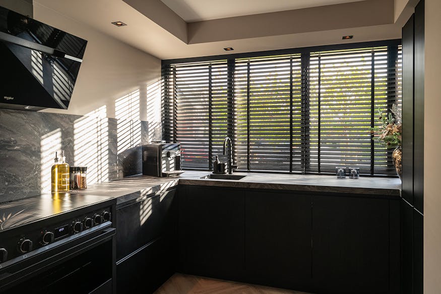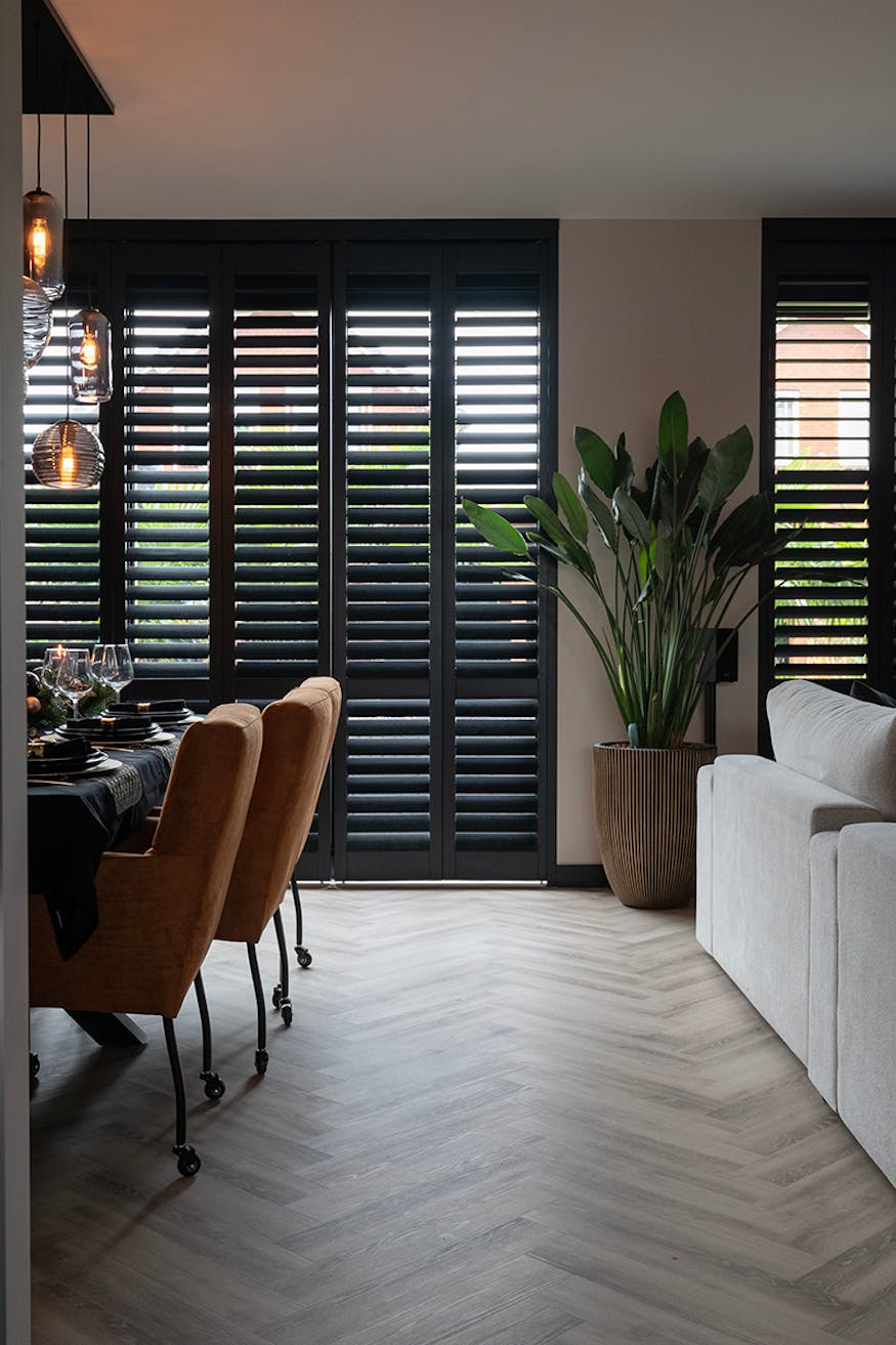Keetie en Peter vertellen: ‘’Voor de nieuwe raambekleding zijn wij langsgegaan bij inhuis plaza in showroom Barendrecht. Hier zijn we heel fijn geholpen door Annemiek waardoor we hebben gekozen voor zwarte vouwrail shutters in de woonkamer en elektrische houten jaloezieën in de keuken. De keuze voor zwarte shutters vonden we wel een beetje spannend, maar we hebben tot op de dag van vandaag nog geen spijt gehad.’’ De zwarte shutters zorgen écht voor de final touch in dit luxueuze interieur.