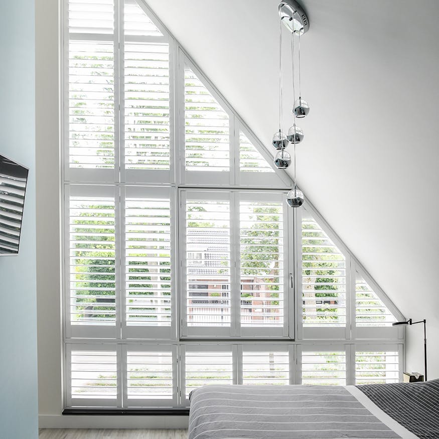 Onze absolute favoriet bij schuine ramen: shutters. De kracht van maatwerk shutters is dat er voor praktisch elk raam een oplossing is. Zeker schuine ramen kunnen mooi worden afgewerkt met shutters. De lamellen van de shutters houd je open voor veel lichtinval en sluit je gemakkelijk om de kamer te verduisteren. De shutters kunnen op verschillende manieren worden uitgevoerd, bijvoorbeeld in de vorm van een klappaneel of een schuifpaneel.